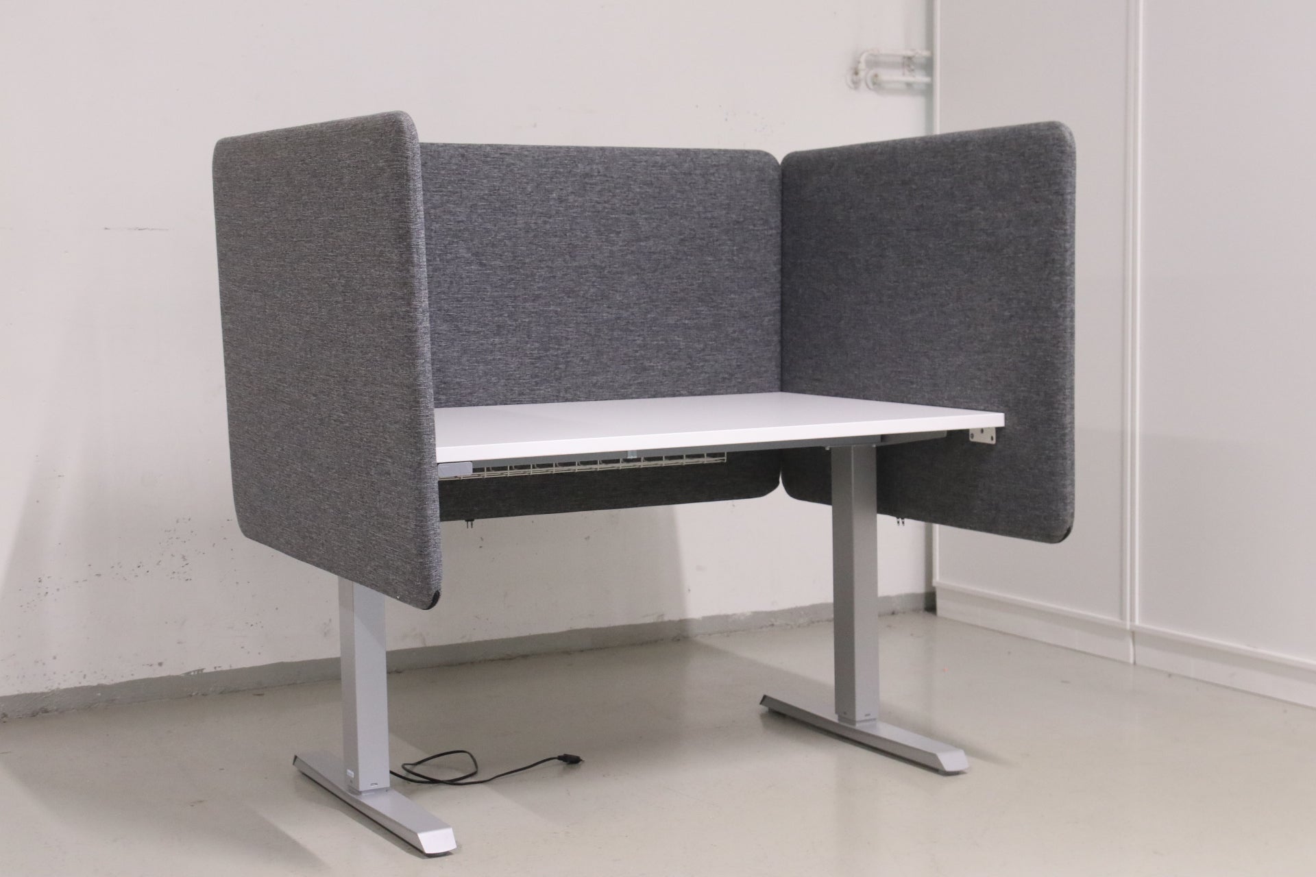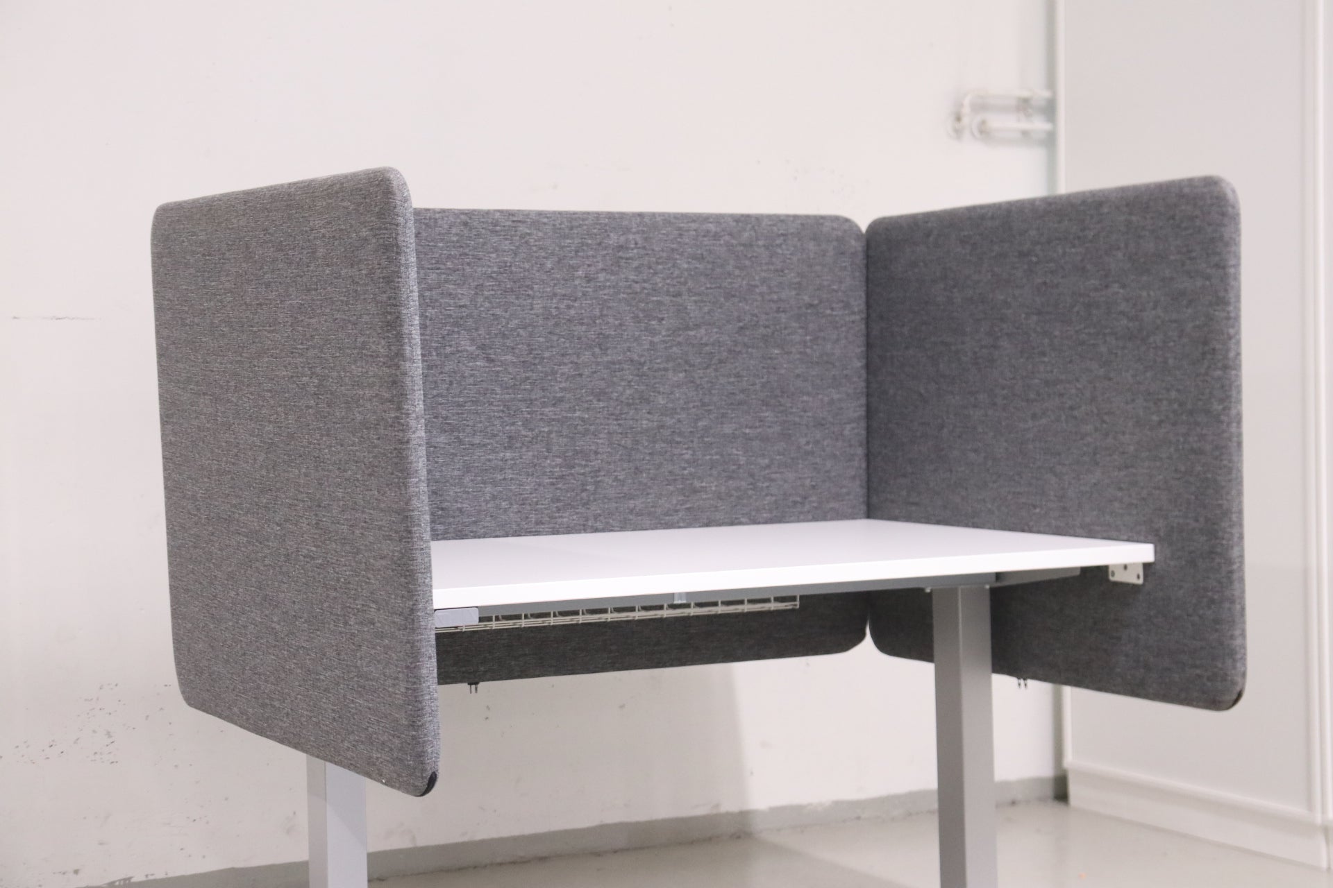 Narbutas harmaa akustoiva pöytäsermi 120 cm – erinomainen kunto. Parantaa akustiikkaa ja työrauhaa.